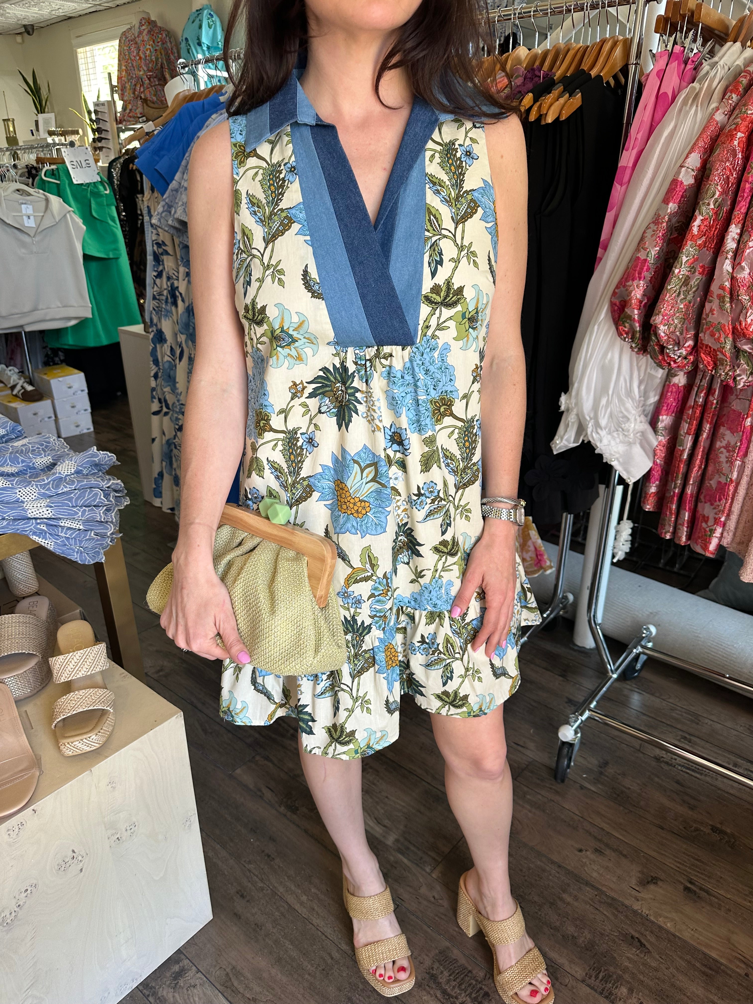 Sleeveless mini dress with blue and green floral pattern, denim contrast stripe collared v-neck, and ruffle trim.