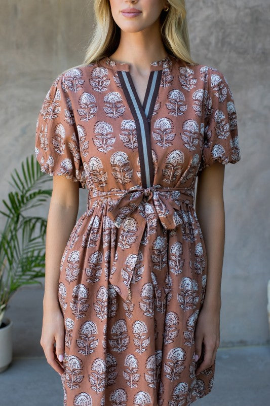 Tan dress with floral block print, short puff sleeves, side pockets, tie waist, and contrast trim v-neck. Boxy fit.