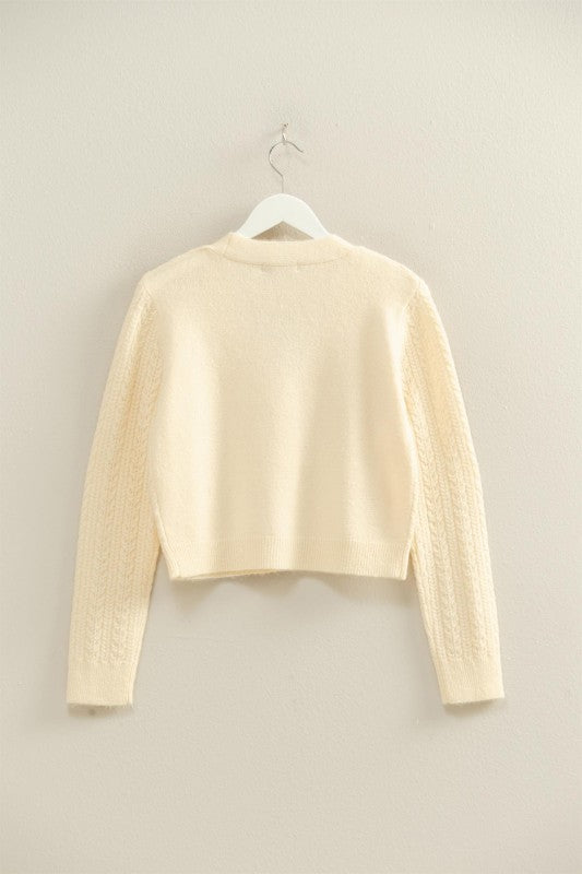Cream knit cardigan with cable knit front detail, long sleeves, and button front.