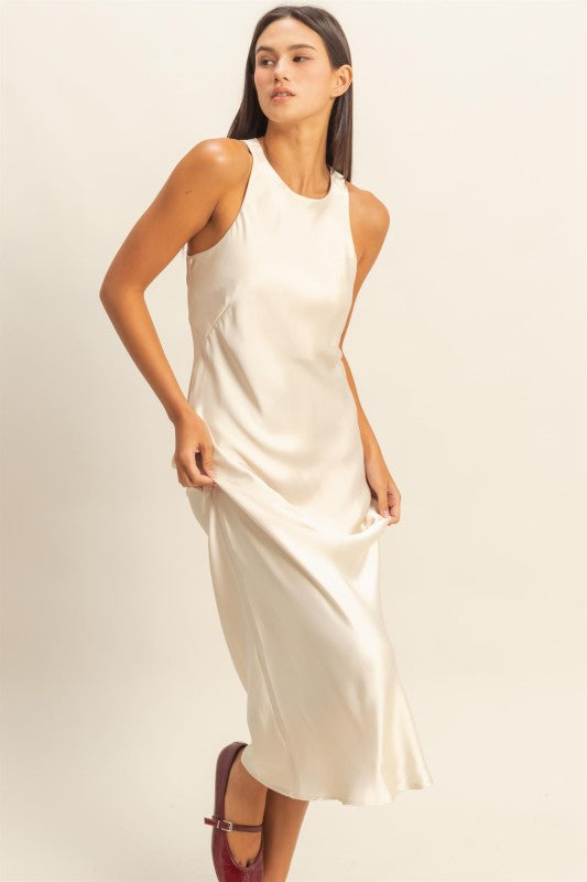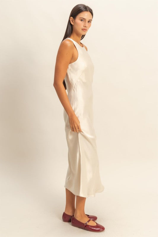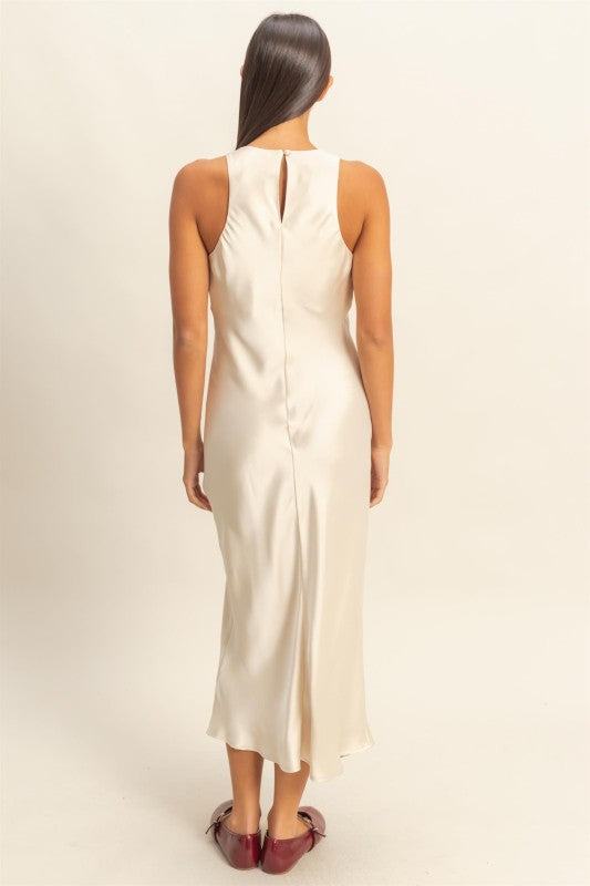 Cream silky sleeveless midi dress with round high neck and bust dart details.