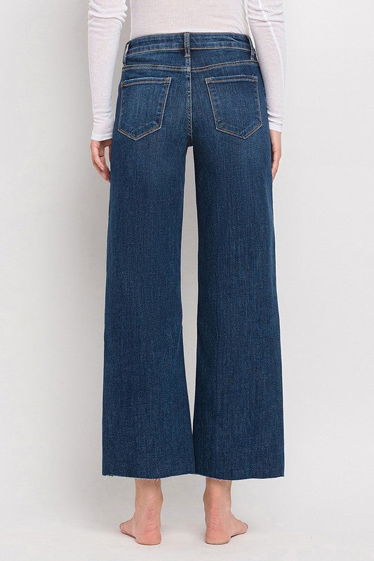 Dark wash jeans with wide leg, mid rise, tummy control top, and raw hem.