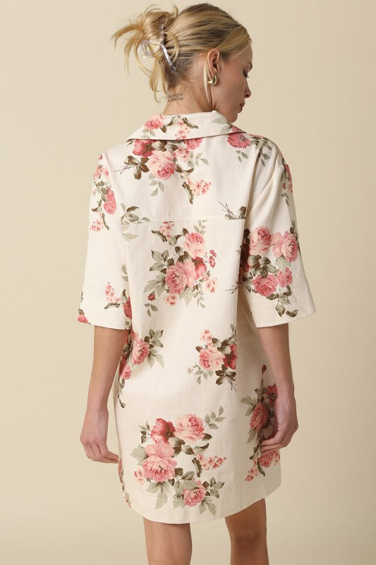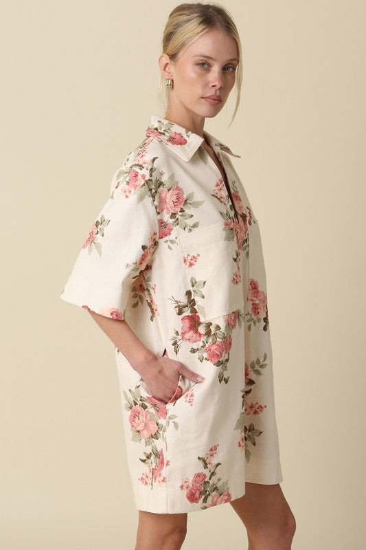 Cream denim dress with pink floral pattern, collared v-neck, short sleeves, side pockets, and chest pockets details.