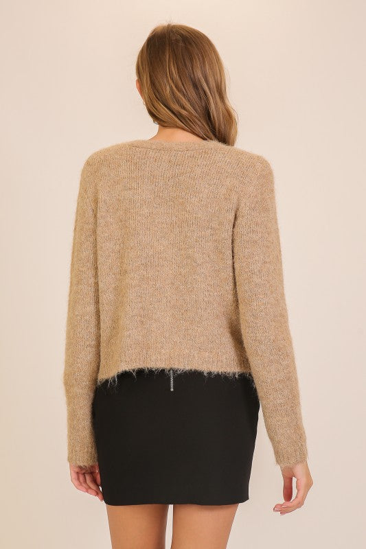 Crafted with a unique two-in-one look, this cardigan features a built-in inner layer in a soft cream hue, subtly peeking from underneath the outer camel cardigan shell with contrast button styles-round clear buttons on the inner knit and silver-toned geometric buttons on the outer layer.