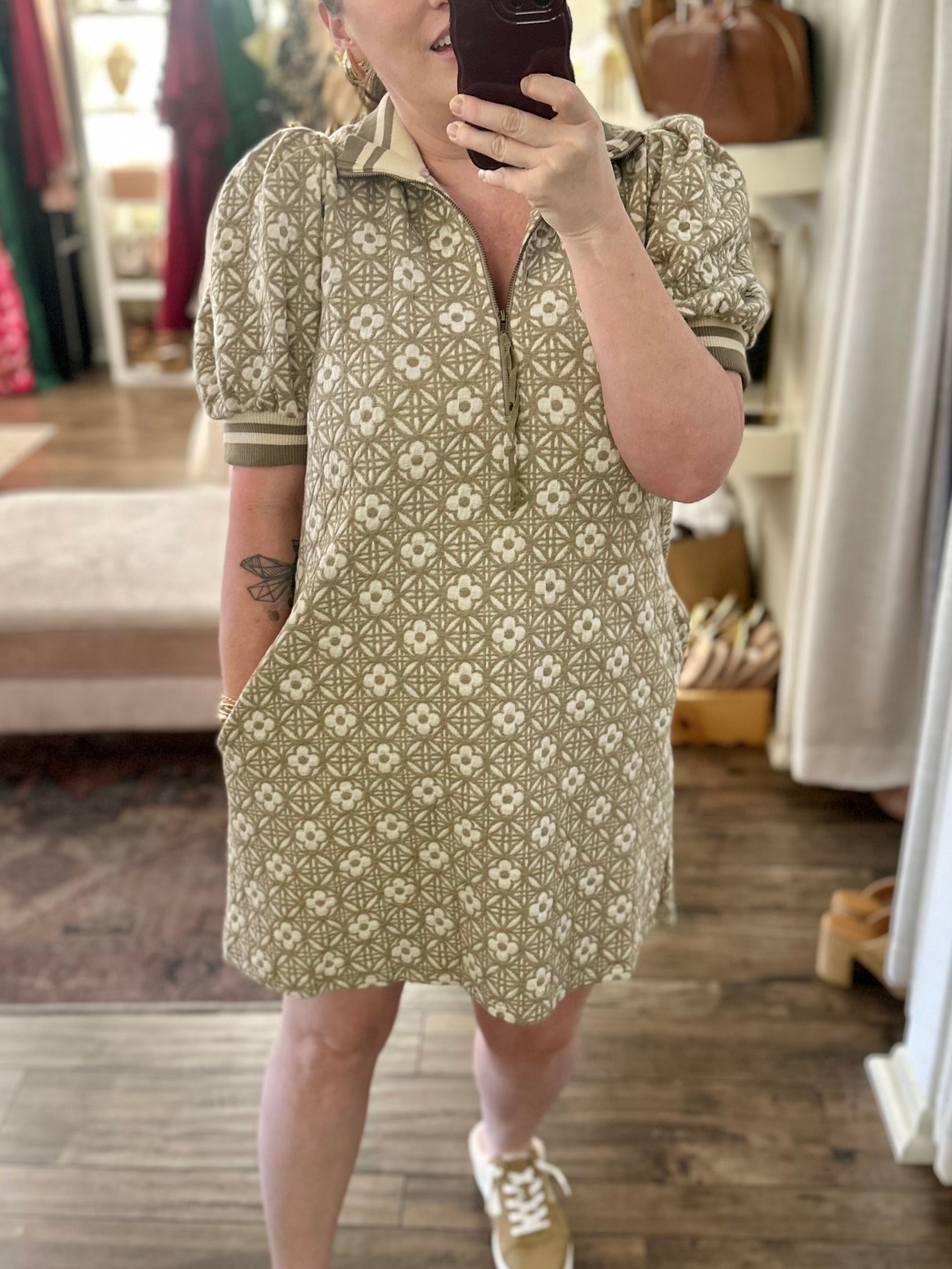 Mocha and beige textured floral shift style knit dress with bomber details.