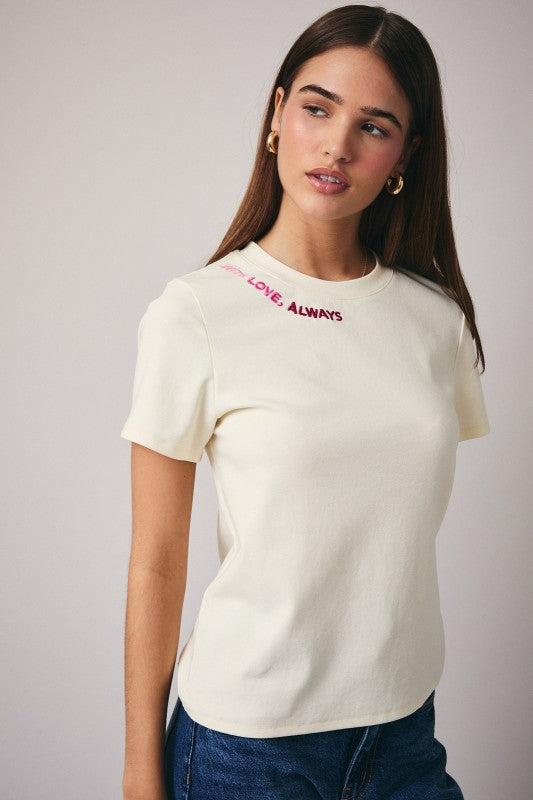 Cream crew neck t-shirt with "with love, always" Embroidery on neck and short sleeves.