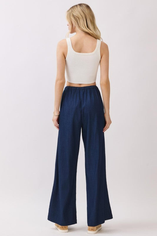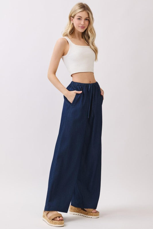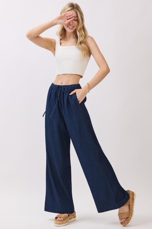 Dark wash soft denim wide leg pants with elastic drawstring waist and side pockets.