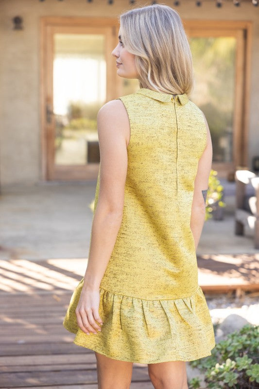 Citrus green mini dress with high folded collar neck, back close, and ruffle hem detail.