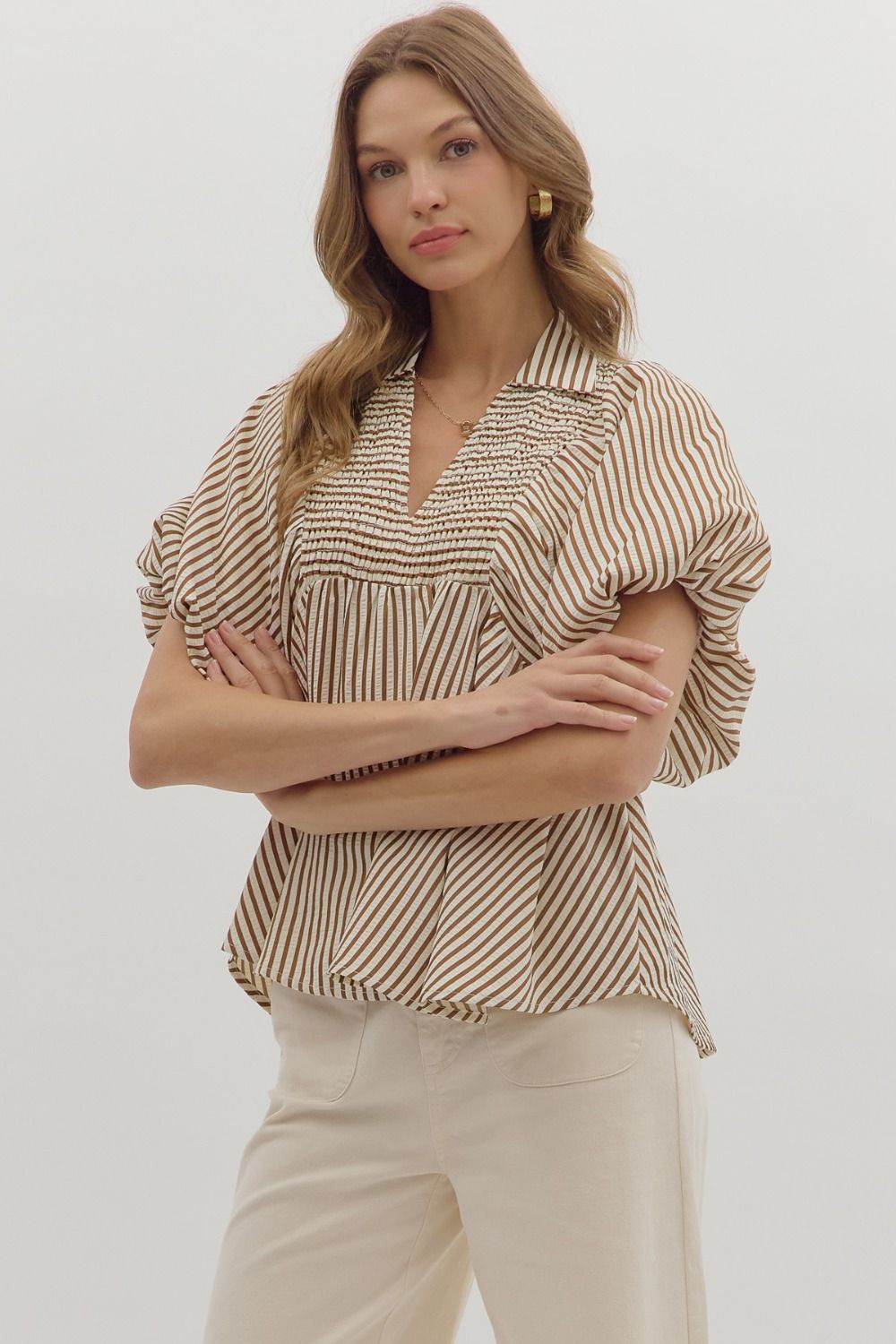 Caramel and ivory stripe short puff sleeve top with v-neck, collar, and ruching at neckline.