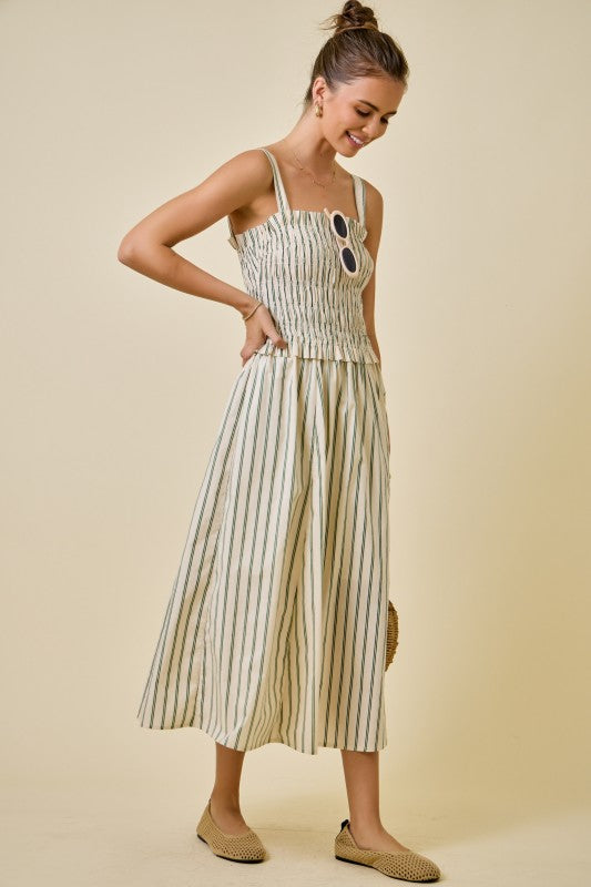 Ivory and green striped midi dress with smocked bodice, adjustable straps, and A-line skirt.