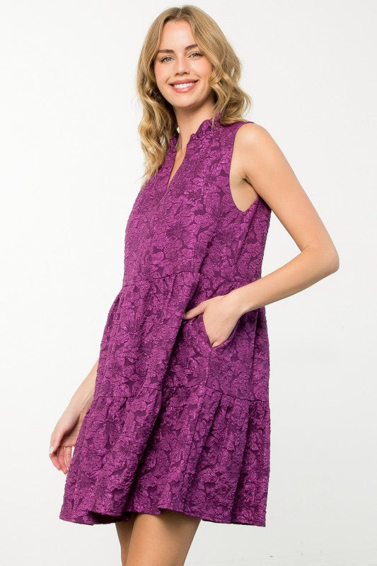Purple sleeveless mini dress with floral texture, tiered skirt, v-neck, and side pockets.