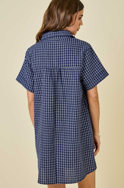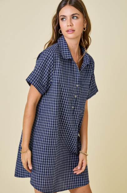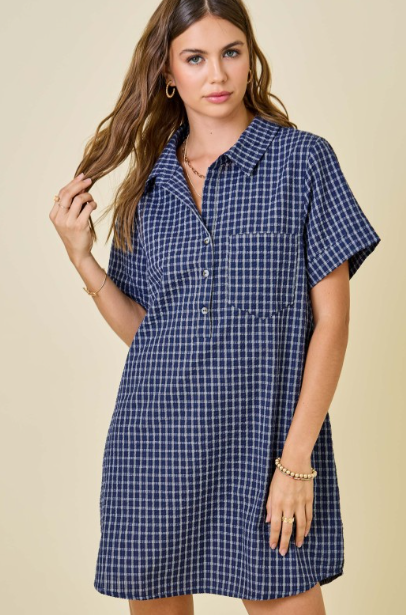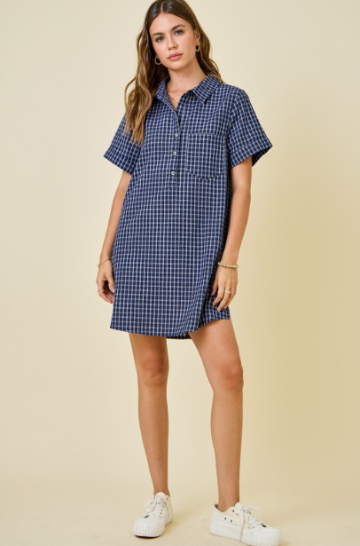 Check print shift style dress with short cuffed sleeves and button/collar at neckline.