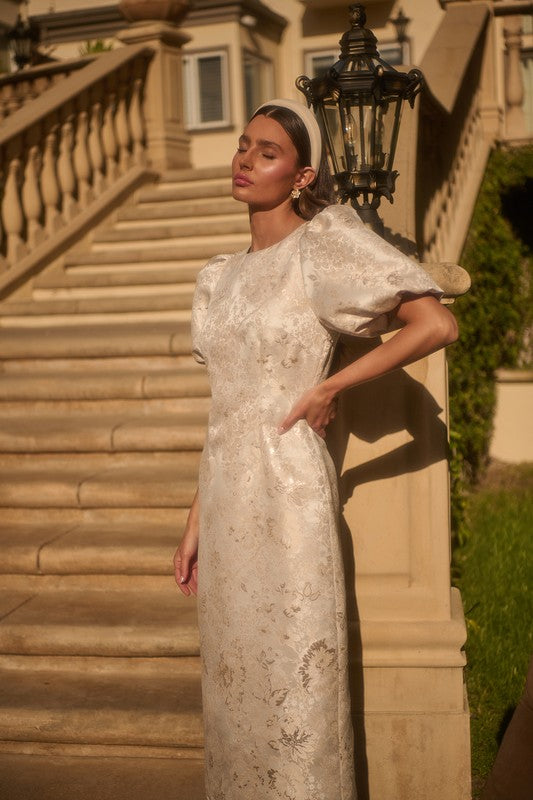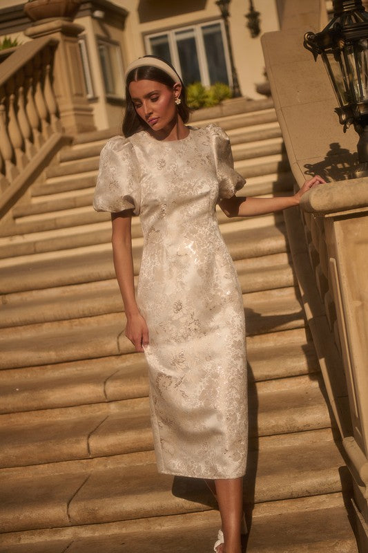Ivory and gold floral Jacquard midi dress with tie back detail and puff short sleeves.