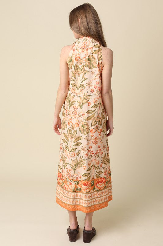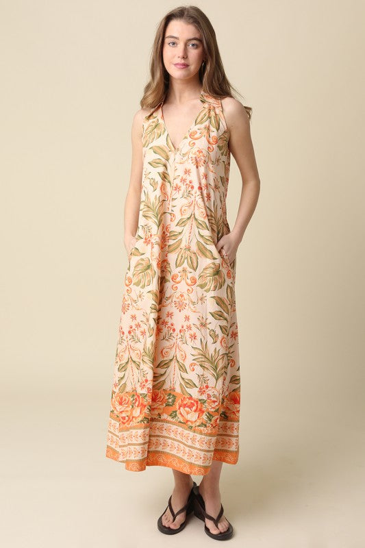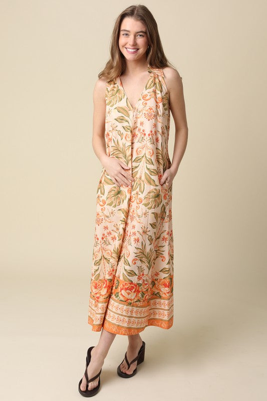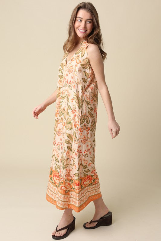Peach sleeveless maxi dress with tropical print, collared v-neck, and side pockets.