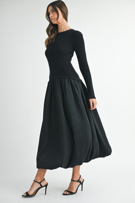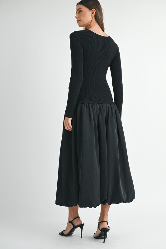 Black midi dress with rib knit long sleeve sweater top, drop waist, and bubble hem silky skirt.