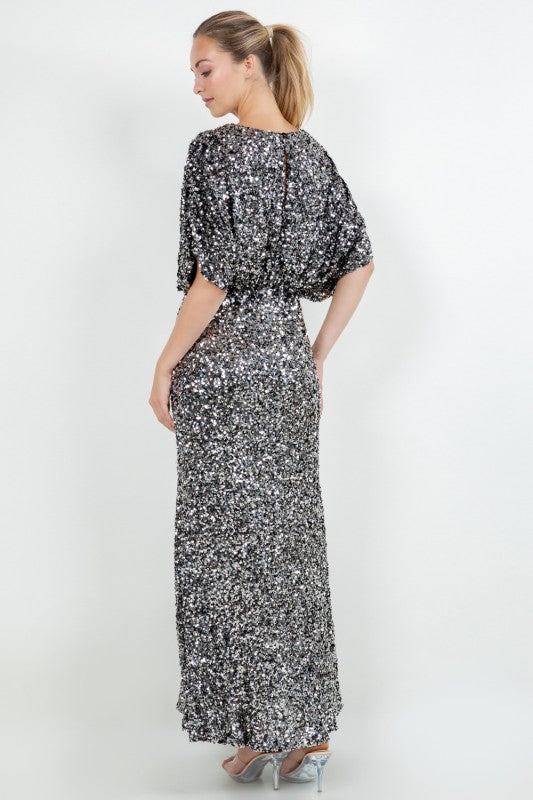 Silver sequin gown with v-neck, open back, drape short sleeves, and elastic waist.