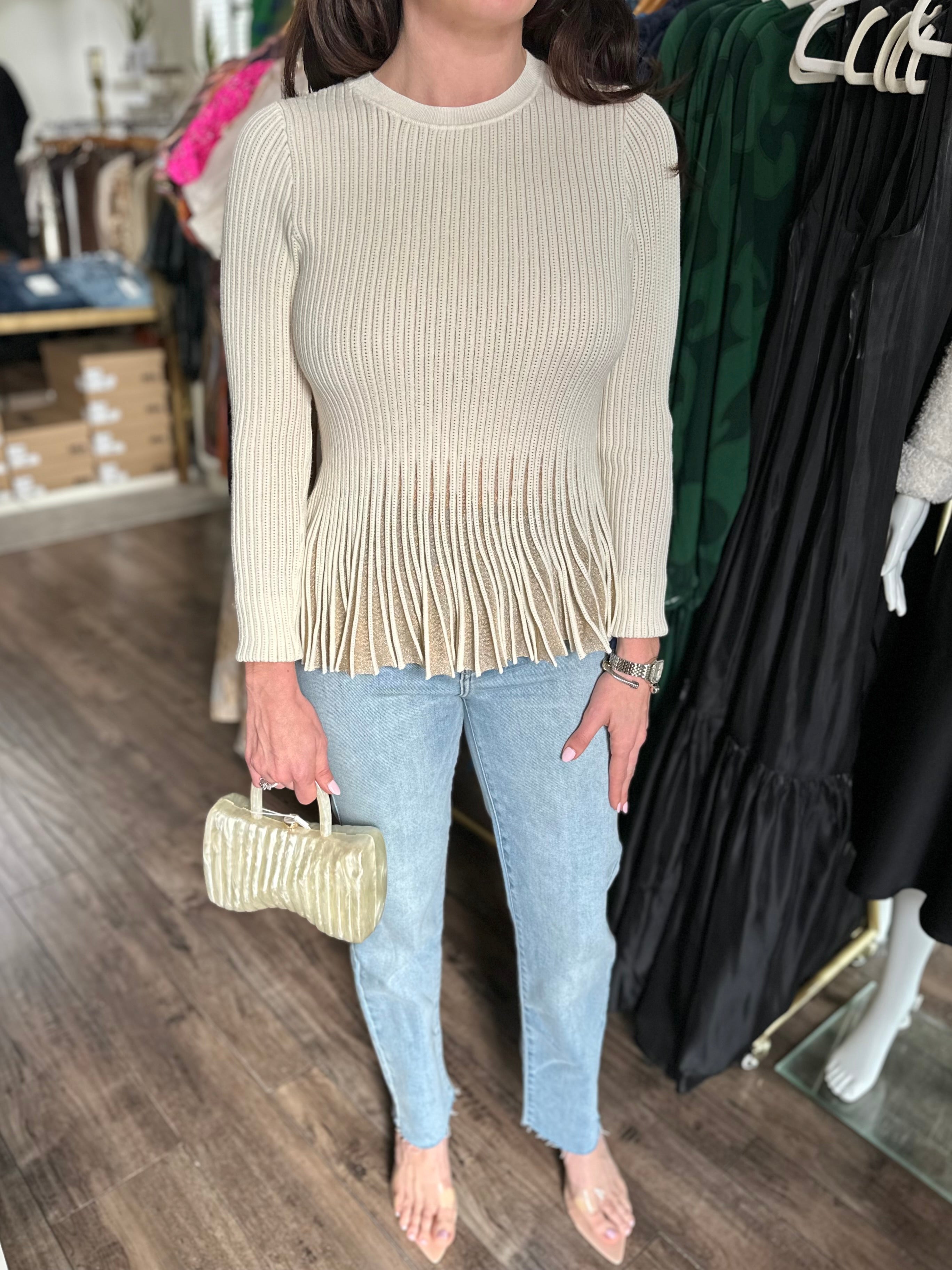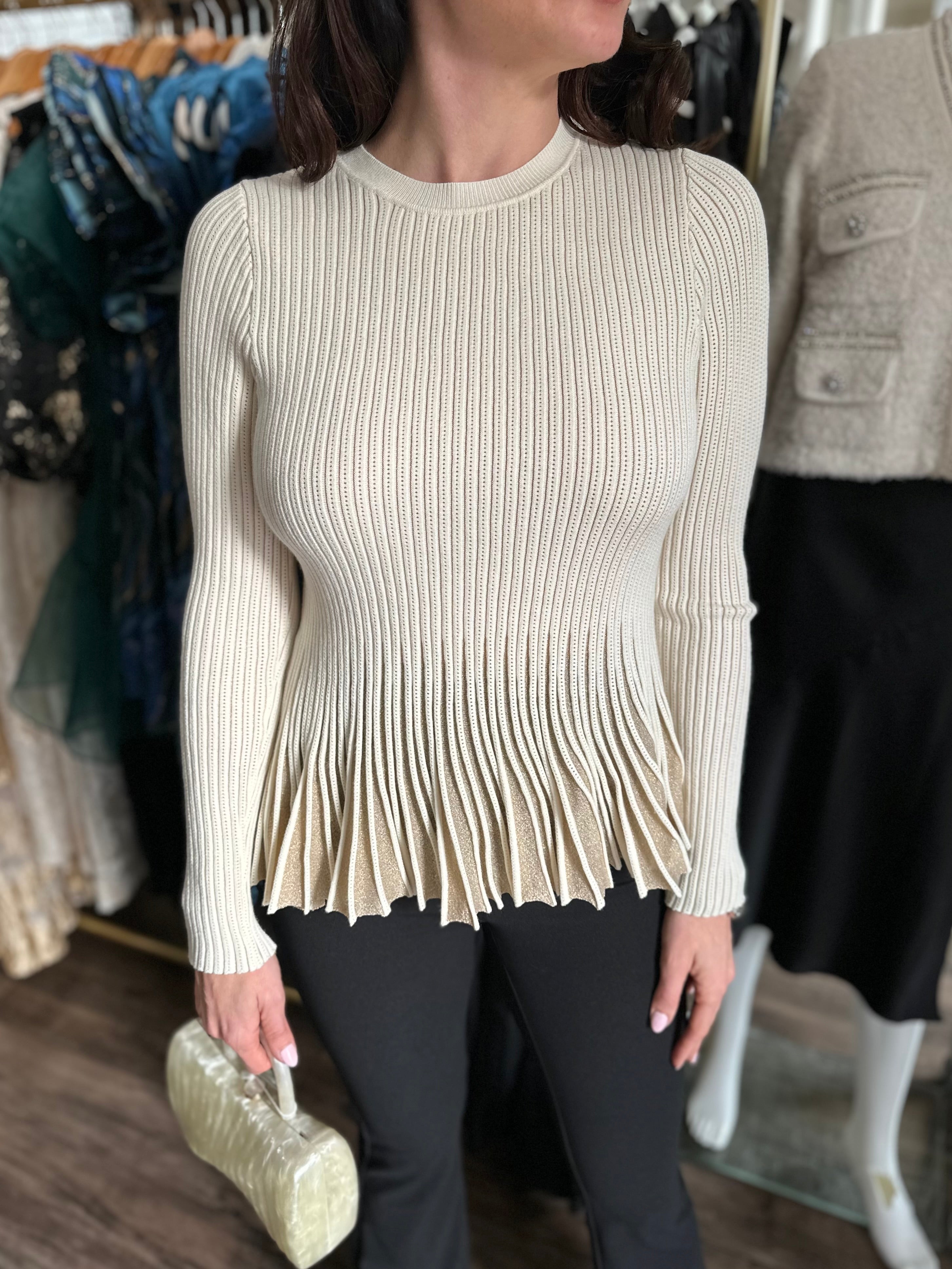 Ivory rib knit knit top with gold shimmer accent, long sleeves, and flared peplum hem.