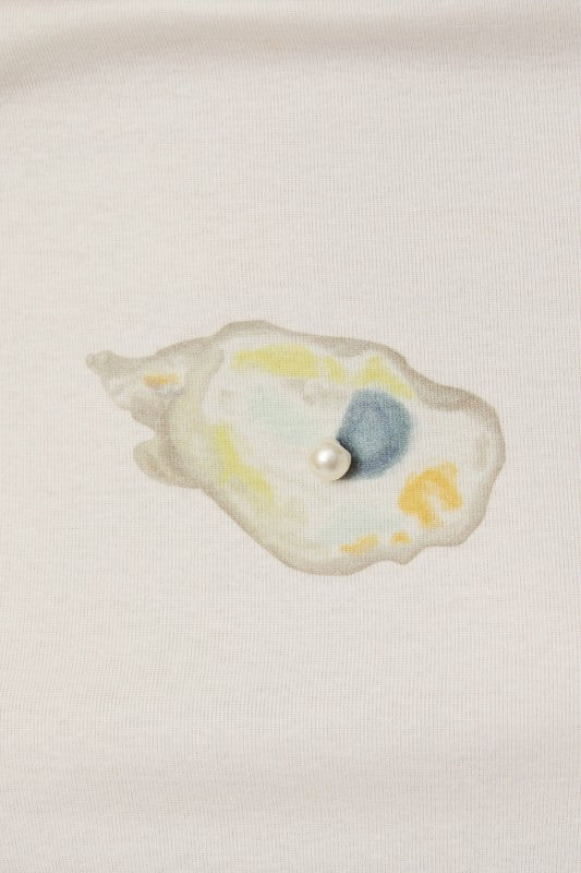 White fitted tee with oyster graphic, pearl detail, round neck, and short sleeves.