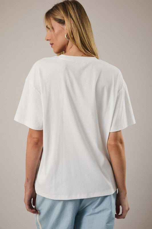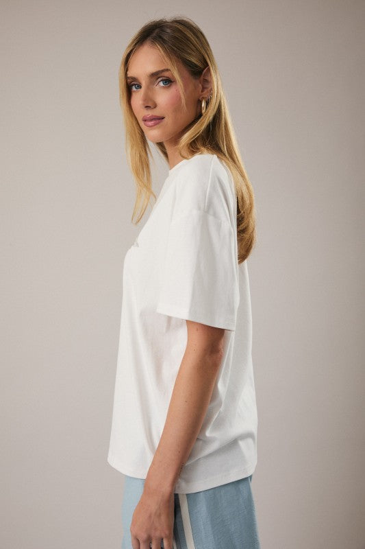 White short sleeve tee shirt with double oyster graphic and round neck.