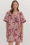 Black floral pattern dress with bustier top, dot texture, off the shoulder sleeves, and front slit.