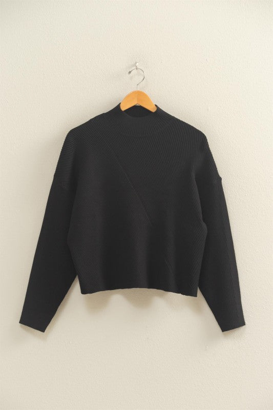 Diagonal rib knit pullover sweater with high neck, drop shoulders, and long sleeves.