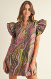Emerald green maxi dress with lighter green abstract pattern, button front, long sleeves, tie belt waist, and side pockets.