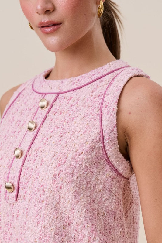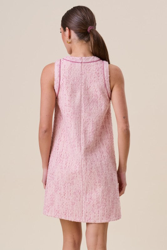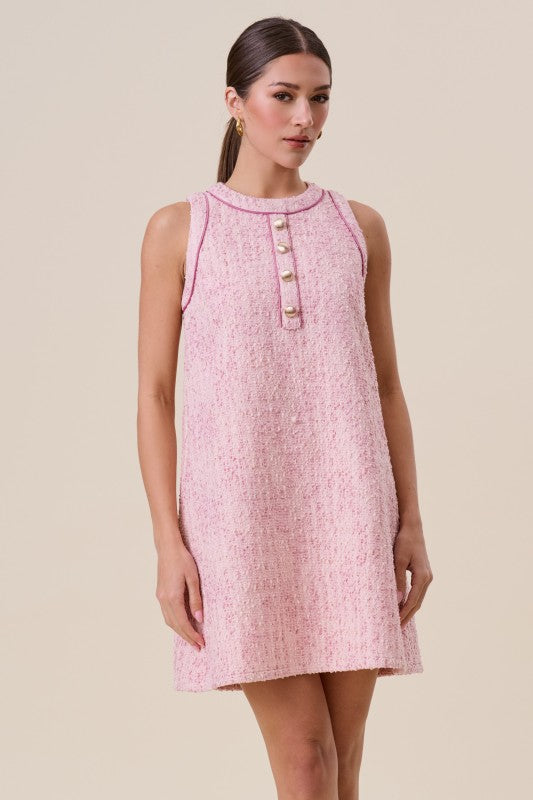 Pink tweed sleeveless dress with gold button front details, satin pipe trim, side pockets and back zip close.